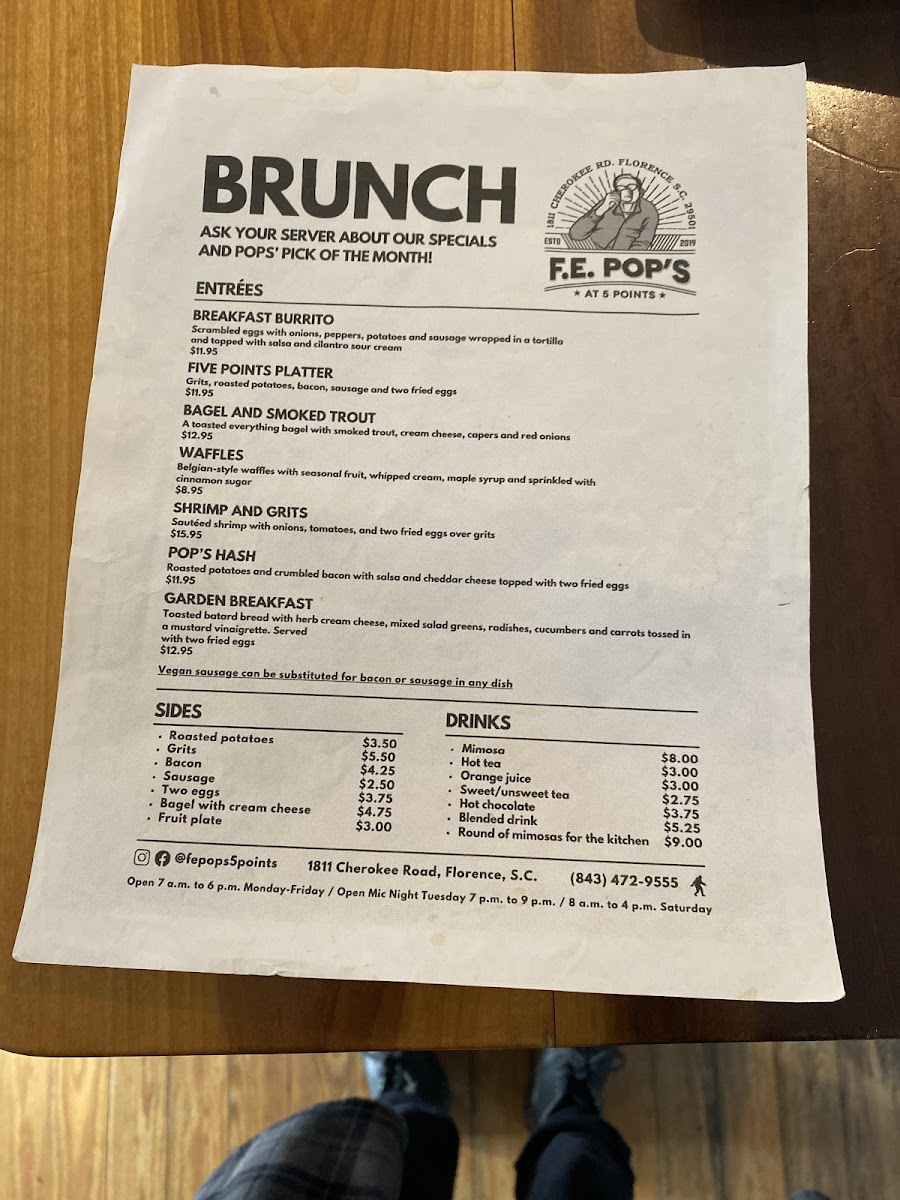 Welcome to F. E. Pop's at 5 Points, a cherished dining spot located at 1811 Cherokee Rd, Florence, SC. This local gem is renowned for its vibrant atmosphere and flavorful cuisine, perfect for brunch lovers and coffee aficionados alike. The menu is diverse, featuring hearty sides like Roasted Potatoes and Bacon, alongside a delightful Grandkids' Menu that includes enticing options like Pops' Pb&J.